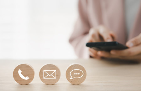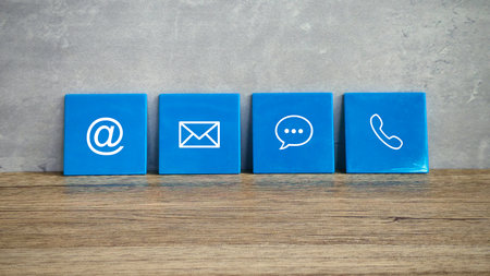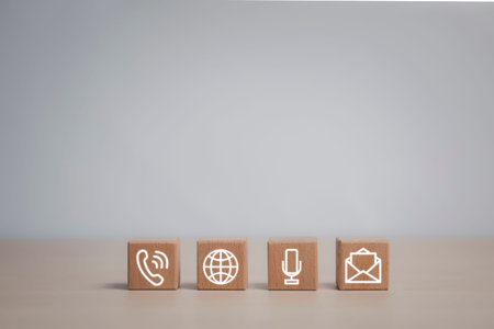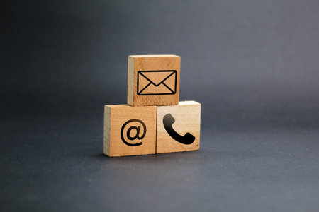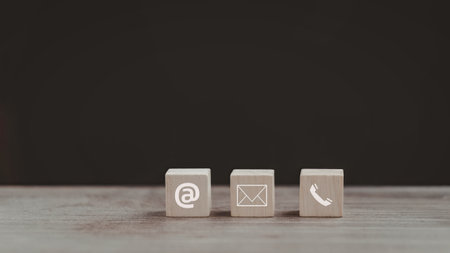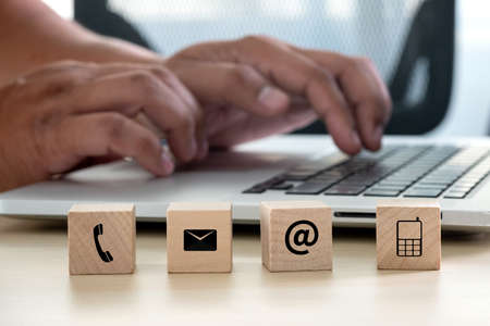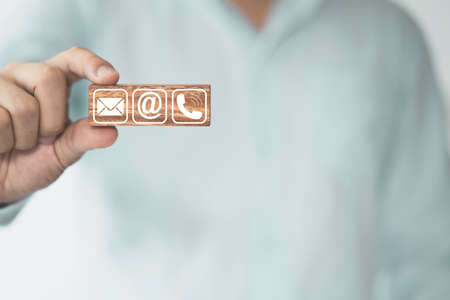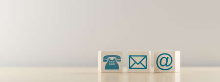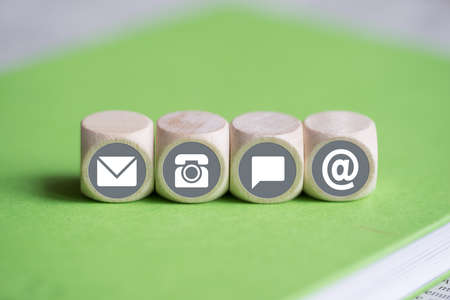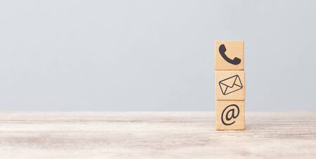 Wooden block with symbol telephone, email, address and comunication. Conceptual of contact us and e-mail marketing concept.