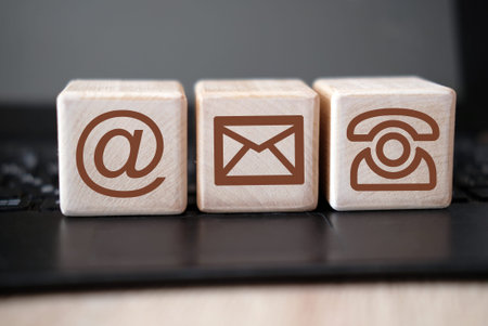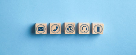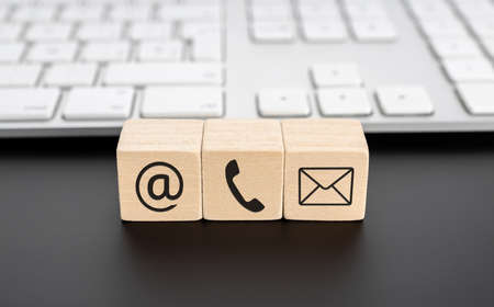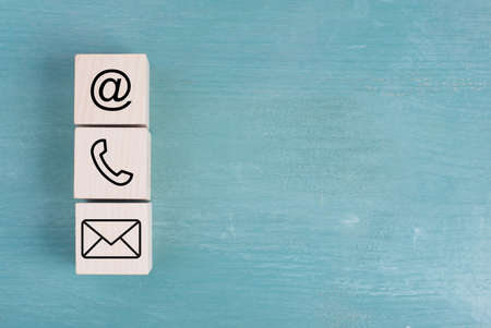 An image featuring three wooden cubes, each with a different contact icon: an envelope, an at symbol, and a telephone receiver.