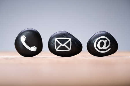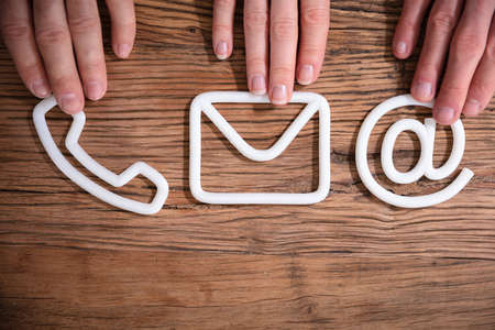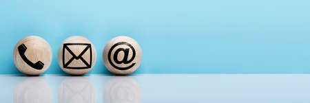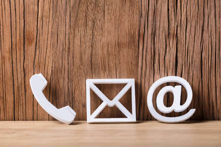 Contact Methods. Close-up Of A Phone, Email and Post Icons Leaning On Wooden Wall