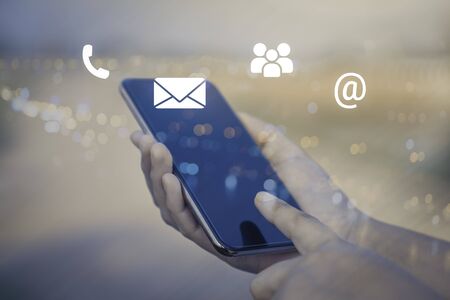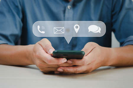 Male hand holding a mobile phone with contact us communication icon. Digital concepts, customer service and marketing, advertising business