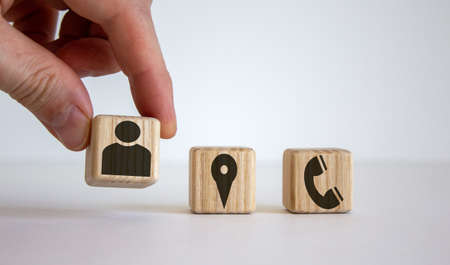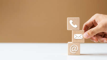 Hand putting wood blocks Cube Symbol Phone, Email, Address. contact or email marketing concept.