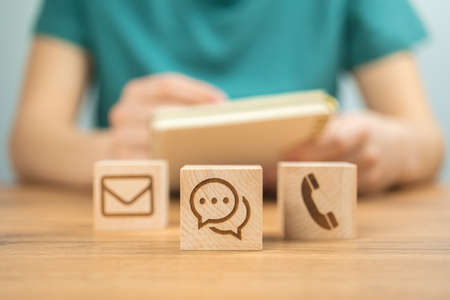 Contact Methods. Close-up of a phone, email, chat and post icons wooden block.