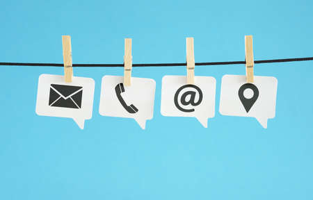 Website contact page concept banner with black contact us web icons and symbols on white paper speech bubbles hanged on blue background.