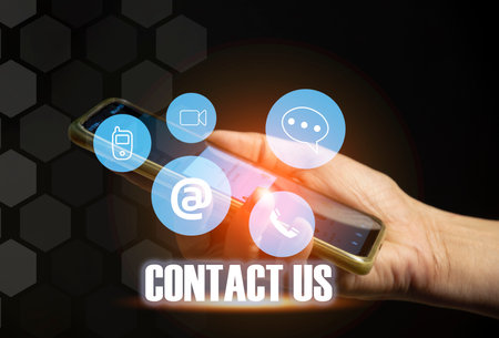 CONTACT US, Hand of a businessman holding a mobile smartphone with the icon. Contact us connection concept with copy space.
