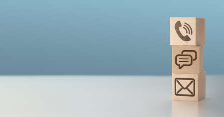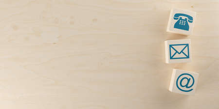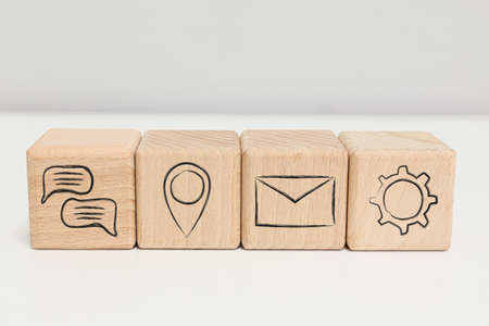 Wooden block with phone, email and address icon. Website page contact us or email marketing concept.