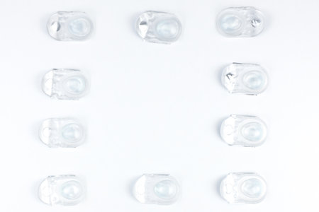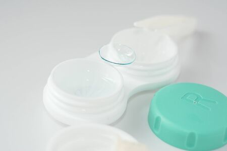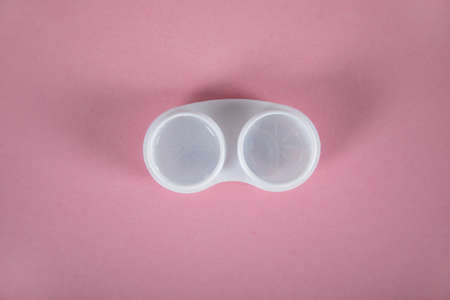 Disposable containers with lenses lying on a friend on a white background with space for text in the center. High quality photo