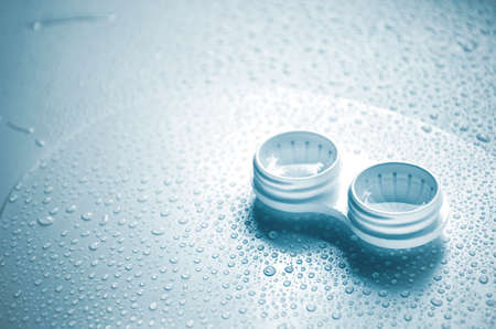 Case with contact lenses. Poor vision, eye problems. Health and disease prevention concept. Drops of water on the background.