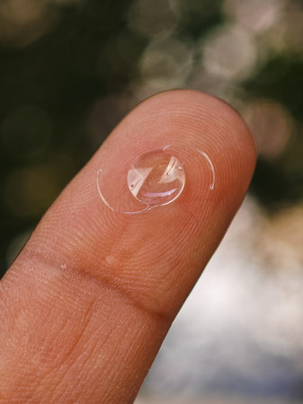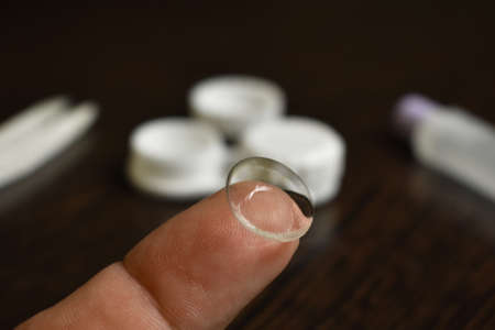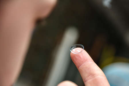 Close-up of contact lens on finger of young man at morning light. Themes eyesight, vision defects, and daily routine.