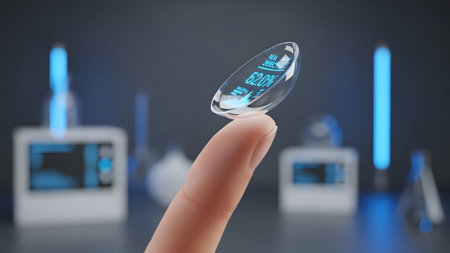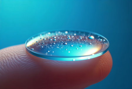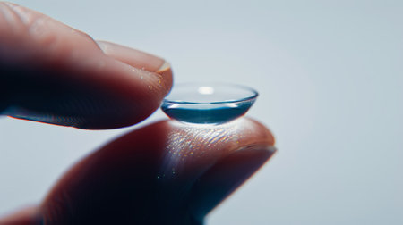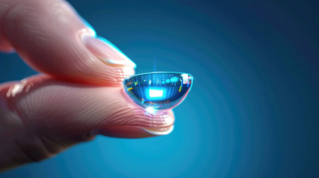 A close-up view of a hand delicately holding a crystal-clear contact lens against a soothing blue background, highlighting its modern design and function.