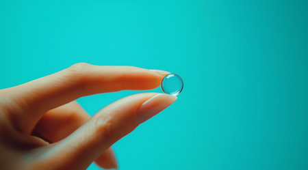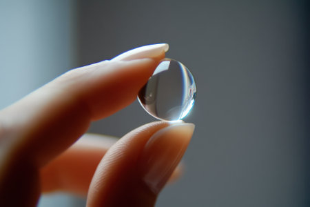 A person delicately holds a transparent droplet, showing its clarity against soft indoor light.