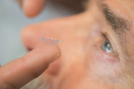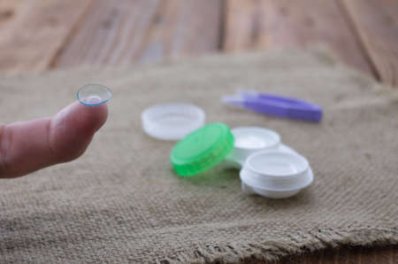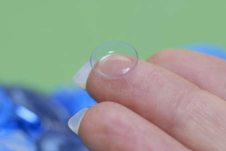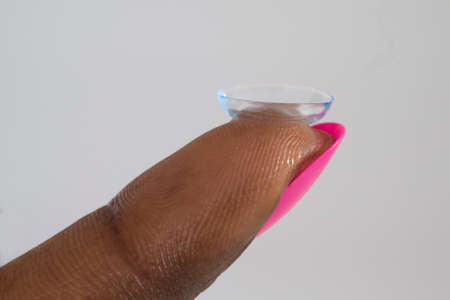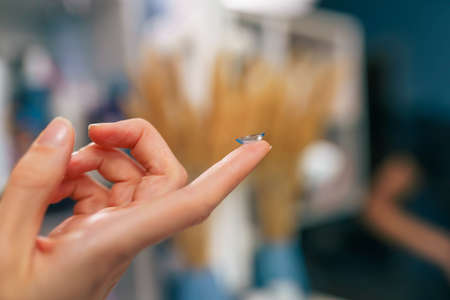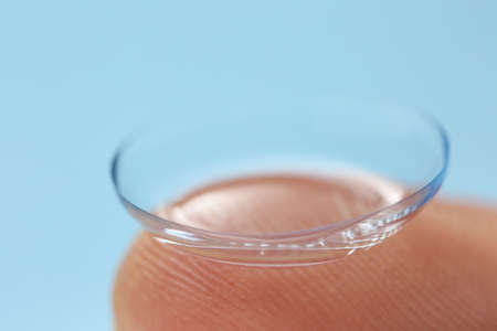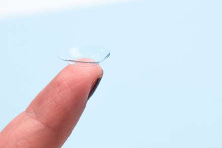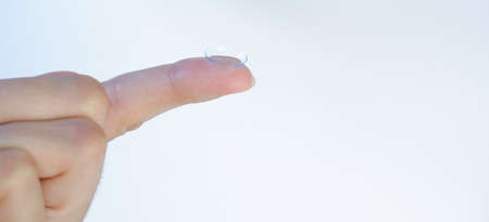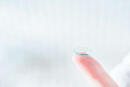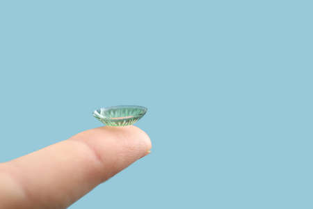 Contact lense on finger tip, macro. Contact lenses macro close up. Man holding lens on finger. Customer, patient or eye doctor, oculist or optician in clinic.