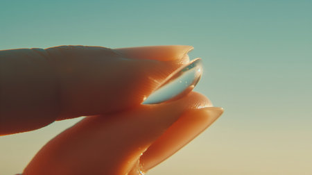 Close-up of a water droplet held between two fingers, glistening in the warm light of dawn.