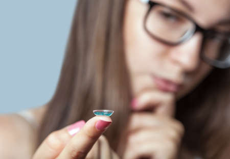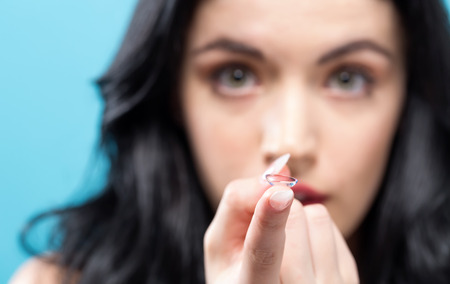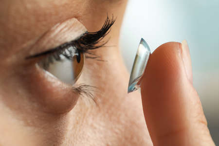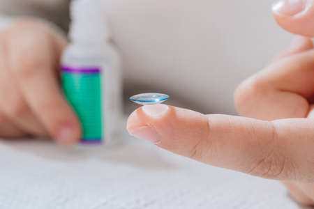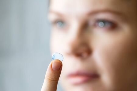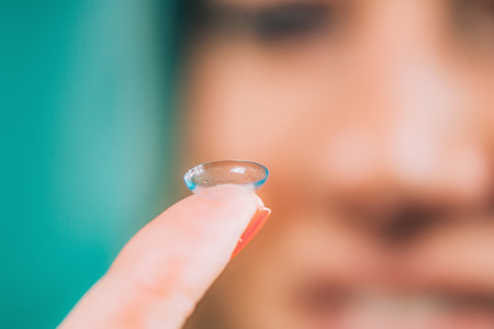 Transparent contact lens in the hands of a woman, preparing to insert it in her eyes