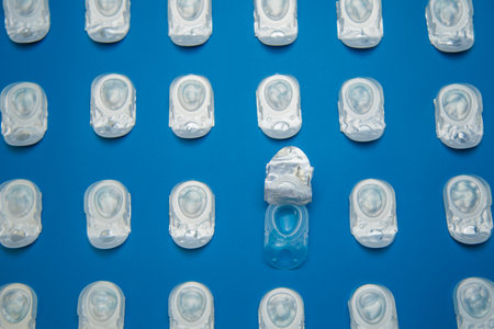 Top view of the layout of daily disposable contact lenses in disposable protective packaging and transparent contact lens on a white background in the center. The concept of ophthalmology, vision correction, eye care. High quality photo