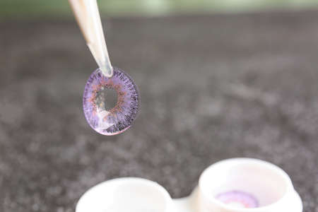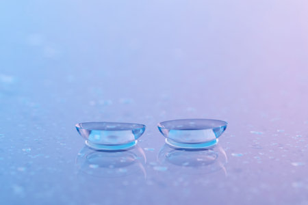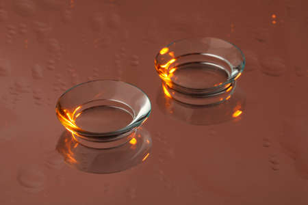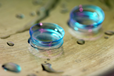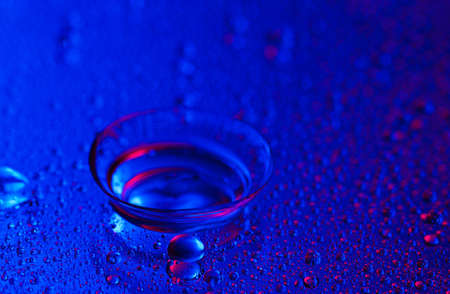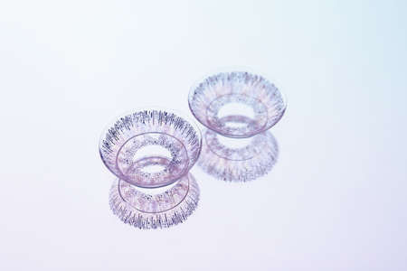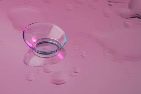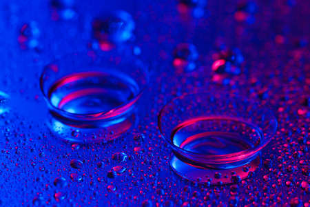 Pair of contact lenses and water drops on purple gradient mirror surface, closeup