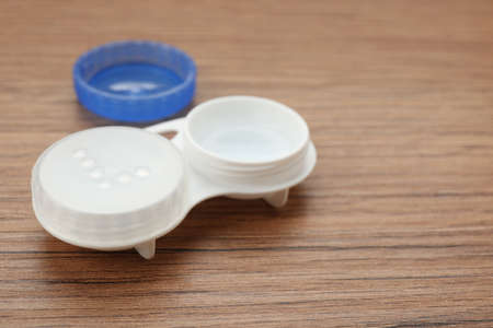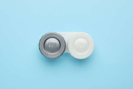 Contact lenses. Case close-up. Lenses are near. Poor vision, eye problems. Health and disease prevention concept. View from above.