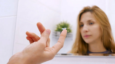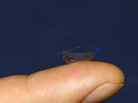 A macro shot of a contact lens gently balanced on a woman's fingertip.