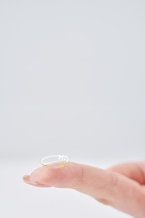 Close-up of contact lenses on a finger on a light clean background. Ophthalmology and vision concept. Generative AI.