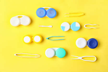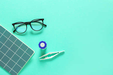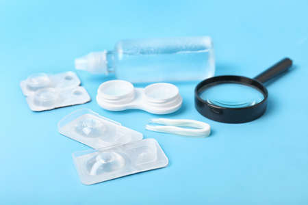 Containers for contact lenses, solution, magnifier and tweezers on color background