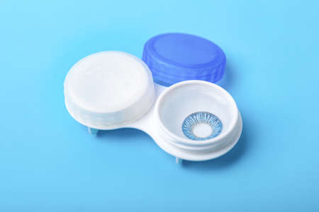 The focus is on an open container with contact lenses on top of which there is a transparent blue lens against the background of containers with contact lenses on a blue background. Concept of vision correction, ophthalmology. High quality photo