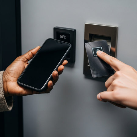 Hand placing a white credit card with an embedded chip over a sleek black payment terminal, illustrating modern contactless payment technology and efficient retail transactions