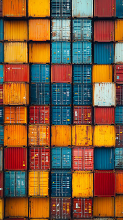 Colorful shipping containers stacked in busy port create vibrant and organized scene. arrangement showcases various colors and sizes, emphasizing scale of global trade and logistics