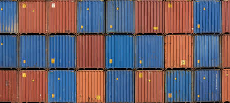 Close-up blue and red logistic container. Cargo and shipping business. Container ship for import and export logistics. Logistic industry. Container for truck transport. Freight transportation concept.