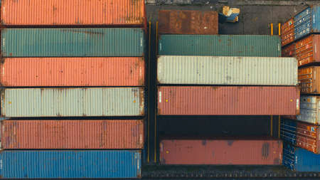 Top down view of colorful containers piles in port container terminal, industrial cargo harbor