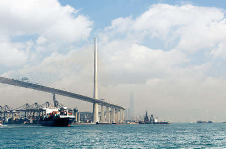 Harbor and freighter with Tsing Ma Bridge in Hong Kong, Asia