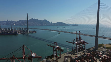 Aerial view of Stonecutters Bridge crossing the bay and the commercial container port in Hong Kong