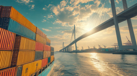 A cargo ship filled with colorful containers navigates a tranquil river at sunset, revealing a stunning bridge and city skyline, representing the maritime industry