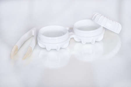Contact lenses and case reflected on white glass table. Horizontal composition. Front view.