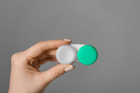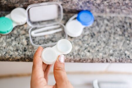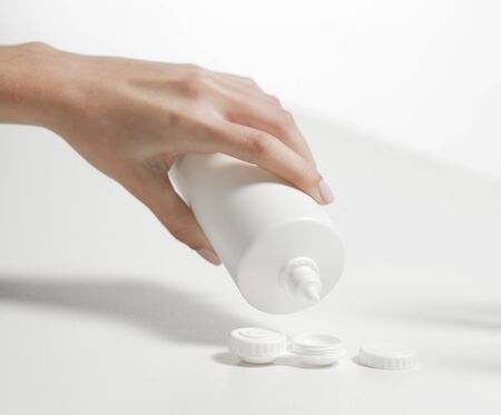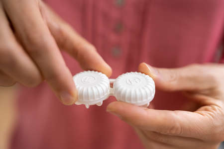 Eyesight and eyecare concept. Woman Hands Holding White Eyelense Container