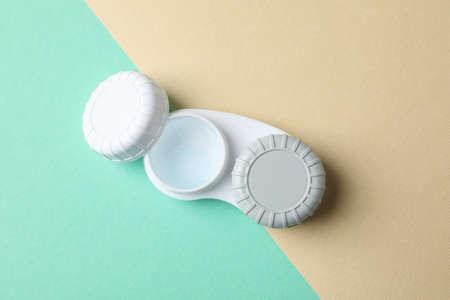 Container with contact lenses on color background