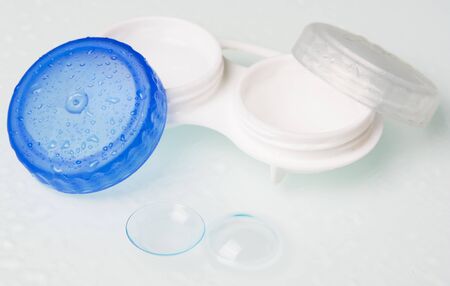 Case with contact lenses. Poor vision, eye problems. Health and disease prevention concept. Drops of water on the background.
