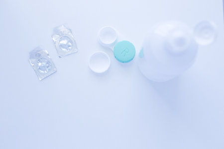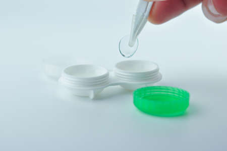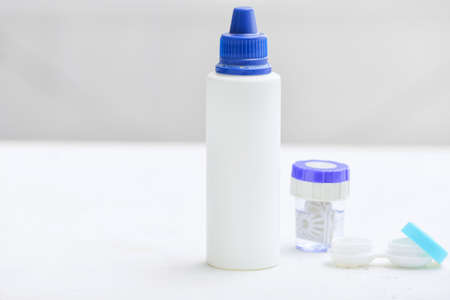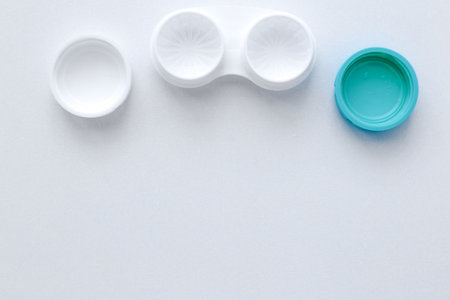 Disposable containers with lenses lying on a friend on a white background with space for text in the center. High quality photo