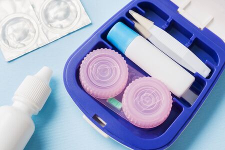 The focus is on an open container with contact lenses on top of which there is a transparent blue lens against the background of containers with contact lenses on a blue background. Concept of vision correction, ophthalmology. High quality photo