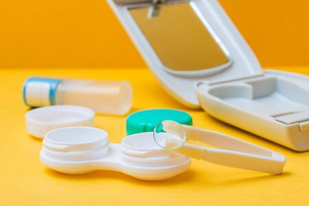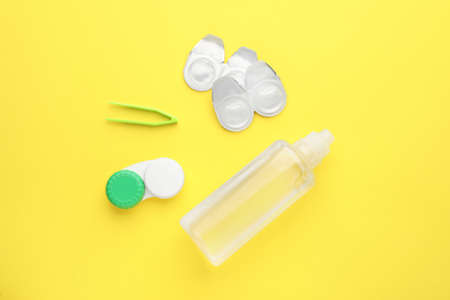 Accessories for storing lenses: container, a bottle of liquid, tweezers and case on a yellow background
