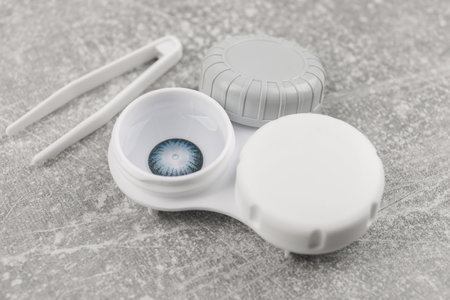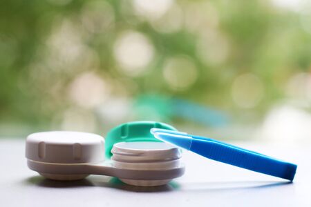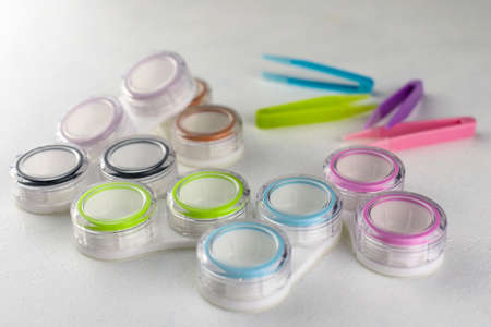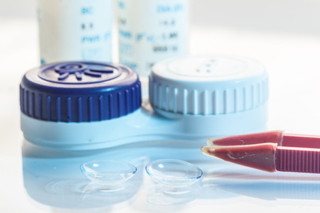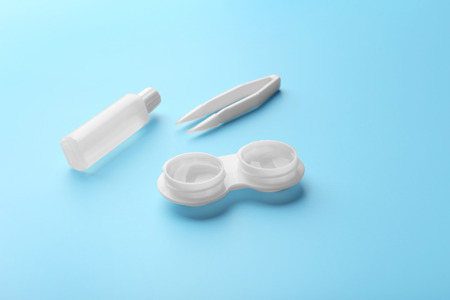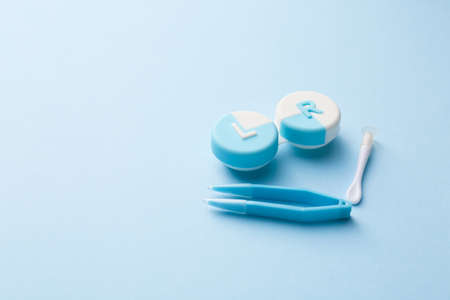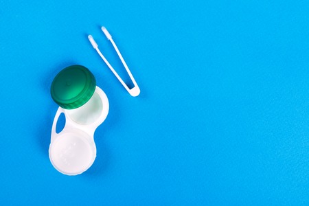 Contact lenses. Case with tongs. Poor vision, eye problems. Health and disease prevention concept.