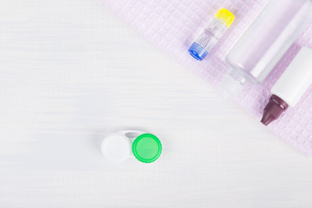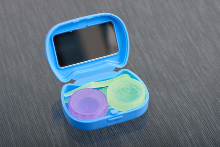 Contact lenses. Case close-up. Lenses are near. Poor vision, eye problems. Health and disease prevention concept. View from above.