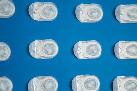 Top view of daily contact lenses in a disposable protective case in which clear lenses float, lying on a blue background at the same distance. The concept of ophthalmology, vision correction, eye care. High quality photo