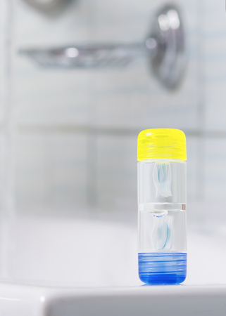 container with two lenses for the eyes in the bathroom stand on the washbasin