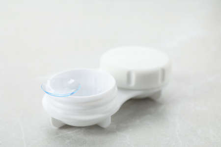 container for soft contact lenses and lens on light background