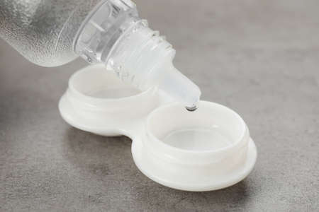 Dripping solution into case with contact lenses on gray table, closeup