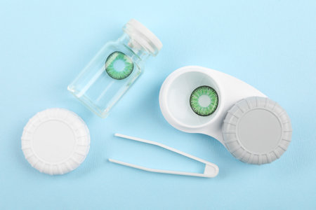 Case with contact lens on light blue background, closeup