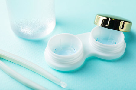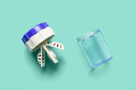 Cleaning case with contact lenses on turquoise background