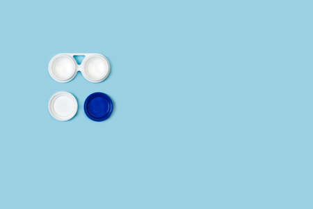 Container for contact lenses on blue background, top view