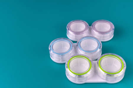 Three colored eye lens containers on blue background. Copy space.