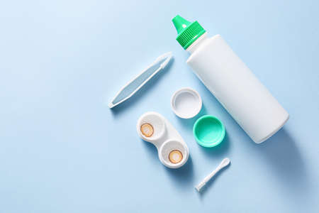 flat lay with contact lenses in containers arranged on blue background
