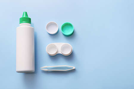 flat lay with sterile liquid in bottle, tweezers and containers for contact lenses on blue tabletop